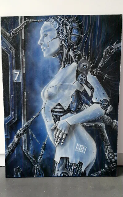 W tym poście pragnę zaprezentować jedno z moich nowych dzieł, obraz na płótnie o wymiarach 120/85 cm pt "Prototyp człowieka" Obraz powstał na wystawę i jest jednym z całego cyklu obrazów zatytułowanych "Człowiek, Maszyna, Tożsamość" namalowanych na wystawę. Cykl ten ma symbolizować połączenie maszyny i człowieka, symbiozę z maszyna Dodam tyle że ten temat będzie eksploatowany jeszcze przez najbliższa 2 - 3 lata. Z tego cyku planuje kilka wystaw. na 2018 i 2019 r. Następnym tematem który będę eksploatował będzie cykl "Genu sieciowego", tematyka powiazana z połaczeniem układu nerwowego z elektroniką. Kilka prac już powstało niebawem opublikuję.